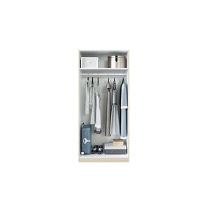 Cuenta con un interior que te sorprenderá por su capacidad pese a las ajustadas dimensiones exteriores del armario. En él encontrarás un perchero de lado a lado del armario donde colgar tu ropa en perchas, y un estante superior a modo de altillo. El suelo del armario queda completamente libre, para que tú decidas qué guardas aquí: cajas de almacenaje, zapatos, mochilas, maletas…