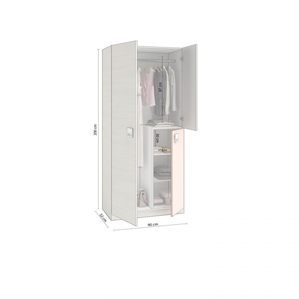 En su interior, el armario está dividido en dos zonas bien diferenciadas: un amplio espacio con barra para colgar ropa, y un módulo con varios estantes abiertos que permite almacenar ropa doblada, cajas, mochilas u objetos personales. Esta doble funcionalidad lo convierte en una solución versátil para jóvenes que necesitan tener todo a mano en un solo mueble.