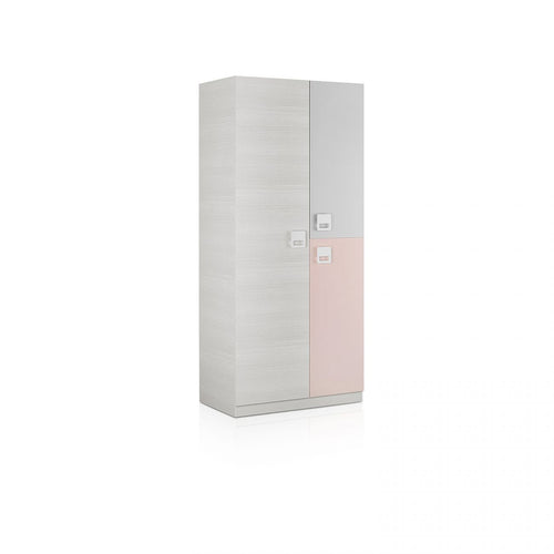 La parte exterior se presenta con un diseño original en contraste de acabados, donde los frentes lisos y las asas integradas aportan un toque juvenil, limpio y minimalista. Las puertas están dispuestas en distintos niveles y colores, aportando dinamismo visual y un aire actual que se adapta fácilmente a diferentes estilos de dormitorio.