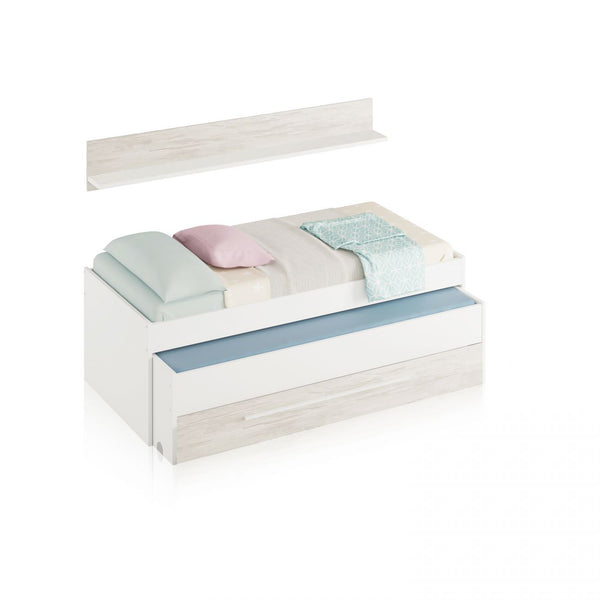 - Cama doble juvenil con capacidad para 2 camas, cajón de almacenaje y con estante de pared