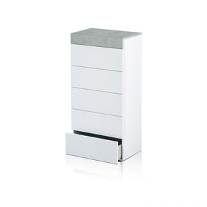Está compuesta por cinco amplios cajones que ofrecen una capacidad de almacenaje muy generosa. Cada uno de ellos permite guardar desde ropa y accesorios hasta documentos u objetos personales, manteniéndolos perfectamente organizados y fuera de la vista. La apertura sin tiradores visibles potencia una estética limpia y homogénea, al mismo tiempo que garantiza una experiencia de uso cómoda y práctica.