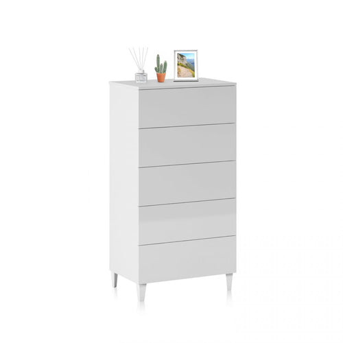 Su estructura compacta y bien proporcionada integra cinco cajones de gran capacidad, perfectos para organizar ropa, accesorios o textiles del hogar. La ausencia de tiradores visibles aporta un acabado minimalista y contemporáneo, manteniendo una superficie lisa y uniforme que armoniza con cualquier estilo decorativo, desde el más escandinavo hasta el más moderno.