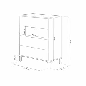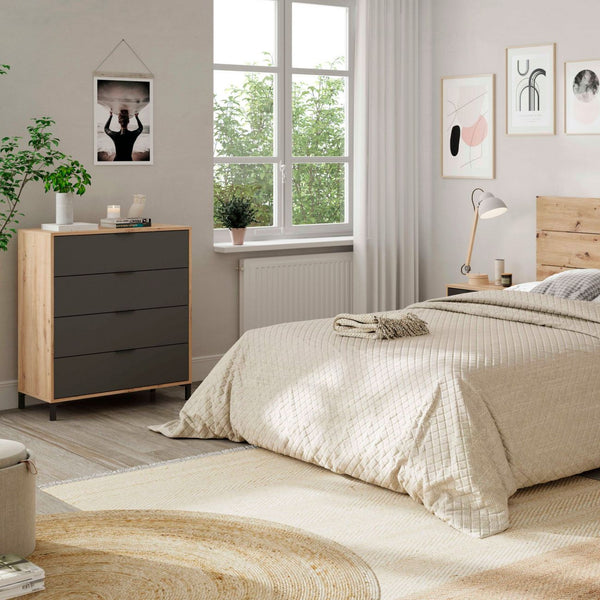 La cómoda Enzo es una cómoda de 4 amplios cajones con frontales contrastados y con 4 tiradores de aluminio lacados en negro. Es ideal para dormitorios de matrimonio o individuales que necesitan espacio de almacenaje adicional: en él podrás guardar ropa de uso diario y de temporada, así como accesorios y complementos que no encuentran su lugar en el armario o las mesitas de noche.