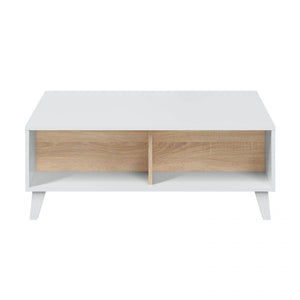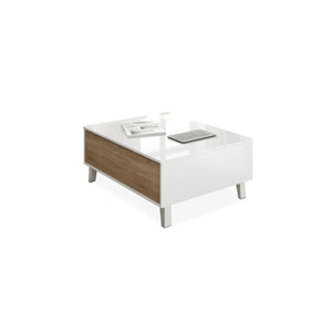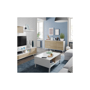 La mesa de centro elevable Zaiken Plus incluye pata nórdica, y está elaborada en melamina de alta calidad, con acabados en color blanco brillo y roble Canadian. Este mueble forma parte de la gama Zaiken Plus de muebles de salón-comedor, entre los que también encontrarás un mueble de televisión y un aparador a juego.