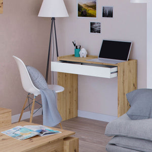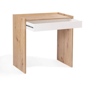 La mesa de escritorio Noa es una mesa de escritorio de reducidas dimensiones con la característica de incorporar un cajón con capacidad de almacenaje. Puede servir como mesa de escritorio pero también como mesa auxiliar para salones o comedores, así poder crear un espacio donde poder trabajar o estudiar en cualquier lugar de la casa. Ideal para hogares con poco espacio que requieran optimizar al máximo el espacio, para apartamentos turísticos, segundas residencias o habitaciones multifunción.