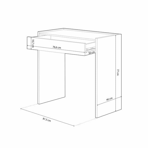 Cuenta con un tablero superior de una superficie útil de 81,5 cm de ancho x 40 cm de fondo. Incluye 1 cajón con una capacidad de 76,6 cm de ancho x 30 cm de fondo x 10,7 cm de alto, con guías correderas metálicas no extraíbles. Además incorpora tacos ABS en la parte inferior, pensados como elemento quitarruidos y antirayado.