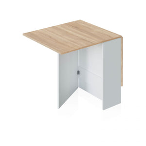 Su diseño simétrico y de fácil plegado permite múltiples configuraciones: cerrada completamente, con una sola ala abierta o totalmente extendida, adaptándose con flexibilidad a diferentes necesidades de espacio. En posición plegada, actúa como una consola auxiliar que puede ubicarse en cualquier rincón.