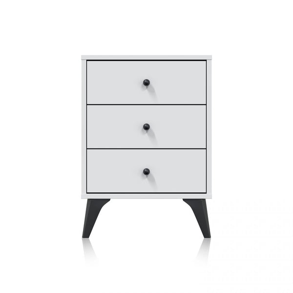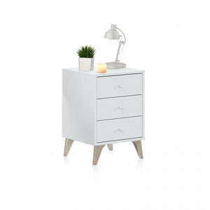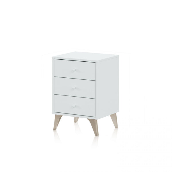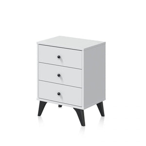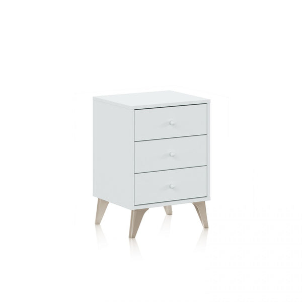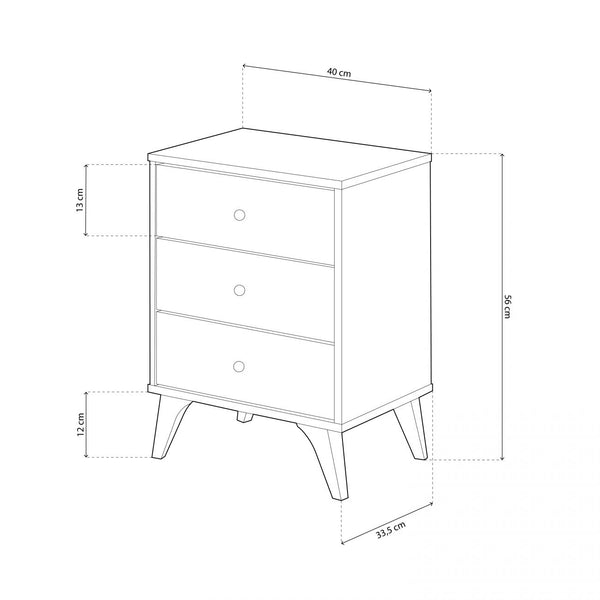 Incluye 3 cajones no extraíbles con guías correderas metálicas y tiradores de bola en ABS, Además, tiene cuatro patas de ligeramente inclinadas hacia fuera, también en ABS.