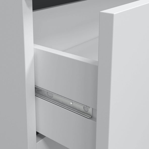 - Materiales: Melamina 15 mm, trasera y cajones en DM, tiradores y patas en ABS, guías metálicas