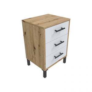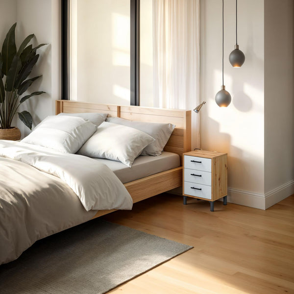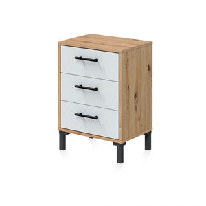 Su estructura cuenta con un acabado en roble natural, proporcionando un aspecto cálido y acogedor que contrasta armoniosamente con los frentes de los cajones en blanco, aportando un toque de luminosidad y sofisticación. Las patas elevadas de metal negro no solo refuerzan su estabilidad, sino que también le dan un estilo industrial moderno, permitiendo que la pieza se integre fácilmente en decoraciones de inspiración nórdica, minimalista o contemporánea.