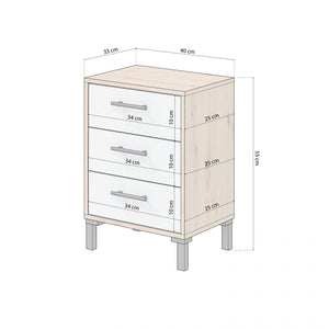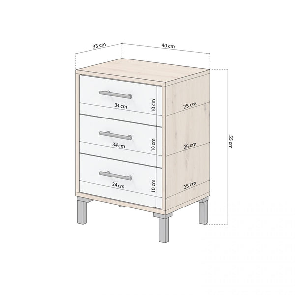 Cada uno de sus tres cajones está diseñado para ofrecer una gran capacidad de almacenamiento, permitiendo organizar ropa, accesorios, documentos o cualquier otro objeto de uso diario. Los tiradores metálicos en negro mate aportan un detalle elegante y ergonómico, facilitando la apertura de los cajones de manera cómoda y fluida.