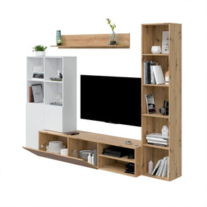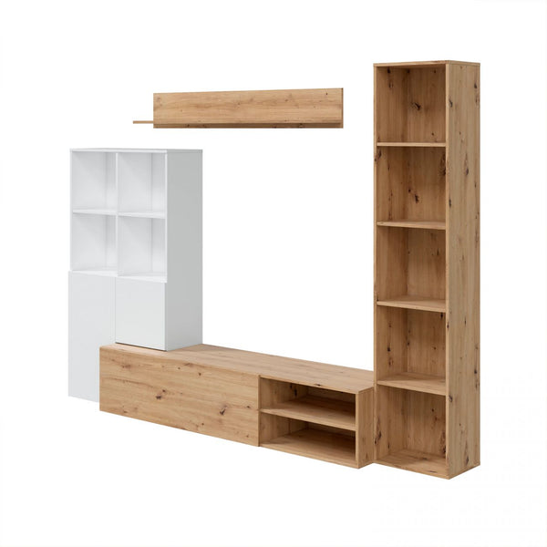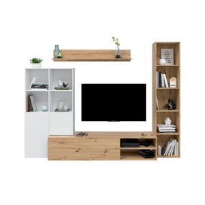 El conjunto se compone de cuatro piezas: un mueble de televisión con una puerta y dos espacios, un estante para colgar, un módulo auxiliar con dos puertas y cuatro espacios y un módulo estantería con cinco espacios.
