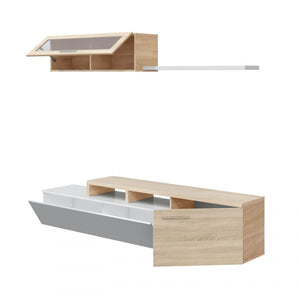 El módulo superior, por su parte, consta de un espacio de almacenaje con puerta de cristal, que se abre mediante un sistema de pistón a gas y presenta colgadores regulables en altura, de tal modo que puedas fijar este módulo en la pared a la altura que más te guste. El conjunto se completa con un estante de color blanco, ideal para libros, marcos con fotos, jarrones y otros objetos decorativos.