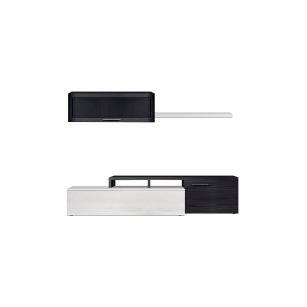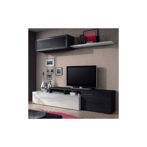 El mueble de comedor Nexus se compone de 3 módulos. El módulo inferior, donde se sitúa la TV, consta de dos amplios espacios de almacenaje cerrados con puertas. Una de estas puertas es abatible, con expulsor y compás de retardo de apertura, y la otra es batiente con bisagra metálica. Este módulo incorpora además 2 huecos a la vista perfectos para aparatos electrónicos como el reproductor de DVD o la consola. Este es el módulo que puedes montar en paralelo o a 90º.