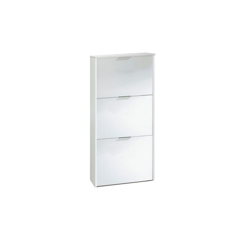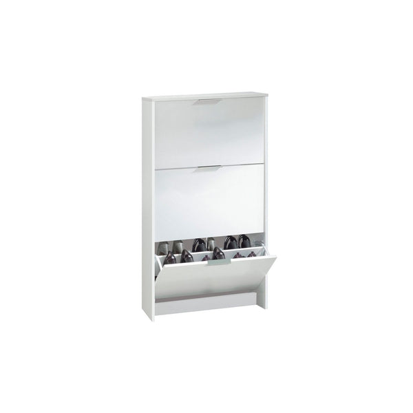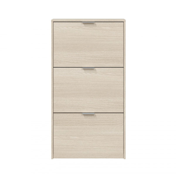 Zapatero moderno de 3 puertas frontales abatibles con capacidad para 18 pares de zapatos. Elaborado en melamina de alta calidad con acabado en color blanco brillo o roble a escoger, es discreto, elegante, de líneas finas y fácilmente adaptable a cualquier estilo de decoración. Combina especialmente bien con muebles de la línea Kendra o de la línea Aura, ambas disponibles en nuestra tienda.