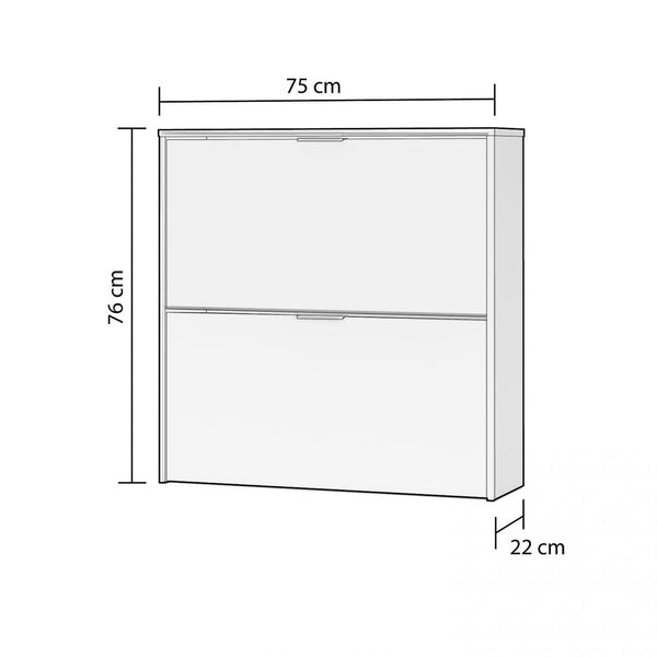 Cuenta con dos puertas abatibles de apertura frontal, que ocultan un práctico sistema de compartimentos dobles pensado para optimizar el espacio. Gracias a esta distribución interna, cada puerta puede albergar varios pares de zapatos, permitiendo mantener todo organizado y al alcance sin ocupar demasiado espacio en el suelo.